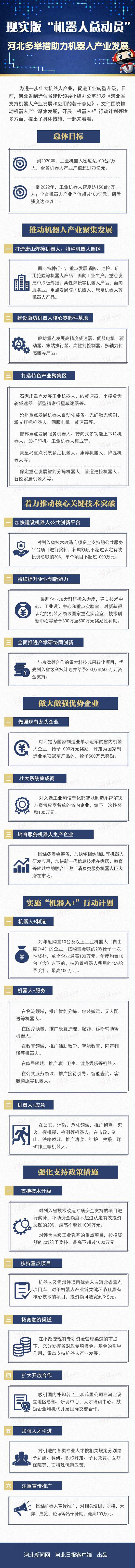 为进一步壮大机器人产业,促进工业转型升级,日前,河北省制造强省建设领导小组办公室印发《河北省支持机器人产业发展和应用的若干意见》。文件围绕推动机器人产业聚集发展,开展“机器人+”行动计划等诸多方面,提出了具体措施,一起来看看。