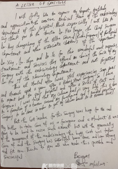 今年29岁的加纳小伙BOTCHWa是杭州一所大学的全日制留学生,然而想不到的是看似阳光的非洲小伙,却来一直被一种怪病所折磨,苦不堪言。 不断发作的腹痛 “开始一直以为是消化不好,胃痛。”小伙说。 1年前BOTCHWa开始出现反复的腹部疼痛,开始以为只是普通的肚子痛,因为经济条件也不好,没有去正规治疗,自己当胃病治了好久。结果疼痛发作越来越频繁,程度也越来越重。 “严重的时候,肚子里、背上就像刀在割,像绞肉机在绞,疼的在床上打滚,什么也吃不下,吐得感觉胃都要翻出来了……”回忆到这里,小伙子又露出了痛苦的表情。 最终实在扛不住了,在哥哥的陪同下,小伙来到了浙江省人民医院就诊。 “像结石痛!”根据小伙描述的症状,医生立即作出了初步判断,并安排了泌尿系平扫检查。果不其然,CT上显示小伙的双肾、双侧输尿管都布满了结石,右肾甚至出现了萎缩,如果再不及时处理,长期积水的肾脏就可能保不住,差一点,就要变成尿毒症了,听到这里小伙惊出了一身冷汗。医生立即为小伙安排了结石手术,先解决梗阻最严重一侧的输尿管结石。 结石?没这么简单! 小伙子平时没有什么特别的不良习惯,如此年轻的年龄发生如此严重的双侧多发结石。经验丰富的医生当时便意识到了问题没有那么简单,安排手术的同时还检查了患者的血钙。 “血钙3.87mmol/l!” 什么概念?化验室的血钙正常参考范围是2.11-2.52mmol/L,血钙大于3.5mmol/L时就应该判定为临床“危急值”了,即可能危及生命或对身体造成严重危害。小伙子常年血液中存在大量的钙,沉积在组织中,因此才会形成如此严重的结石。 那么,究竟是什么导致小伙的血钙如此惊人地升高呢? 罪魁祸首居然在颈部 “甲状旁腺素1253pg/ml!”化验结果惊呆了接诊医生,立即联系了内分泌科,小伙子得的,绝不是什么单纯的肾结石而已。 “原发性甲状旁腺功能亢进(primary hyperparathyroidism, PHPT)指的是甲状旁腺本身的病变,如甲状旁腺腺瘤、甲状旁腺癌,引起的甲状旁腺素(PTH)异常升高,造成高钙血症,并引起反复发作的肾结石和骨病,高钙血症还可以造成厌食、恶心、便秘、烦渴和多尿等症状。”浙江省人民医院内分泌科的华燕吟主任医师告诉记者。 ![]() “甲状旁腺一般位于颈前部甲状腺的后方,一般人有四颗,左右各两颗,黄豆大小,看似不起眼,但其分泌的甲状旁腺素(PTH)是身体调节钙磷平衡的最重要的激素。PTH通过刺激肾小管对钙的重吸收和促进骨吸收,血钙浓度维持在正常范围。同时PTH还通过刺激肾脏维生素D合成,进而刺激肠道钙吸收。当PTH分泌出现异常时,就可能造成血钙升高、骨吸收过度,骨质破坏。”华主任说,“这位患者以结石痛为首发症状,后来完善检查发现全身多处骨质也存在破坏,年纪轻轻就出现了骨质疏松,这都是过高的甲状旁腺素水平导致的。最后通过B超及ECT检查,我们发现患者颈部右侧下位甲状旁腺增生伴腺瘤样结节,考虑是由甲状旁腺腺瘤引起的原发性甲状旁腺功能亢进”。 “大约15%-20%的原发性甲旁亢患者会出现肾结石,反过来,大约5%的肾结石患者具有甲状旁腺功能亢进症,因此当遇到临床常规难以解释的肾结石时,应当考虑到甲状旁腺功能亢进的可能。 治疗陷入纠结?微创结决问题 诊断明确,接下来就是治疗的问题了,然而没想到这时候小伙子却陷入了两难的境地,如果不治疗,居高不下的甲状旁腺素和血钙带来的是骨折、再发结石甚至尿毒症的危险,单纯的内科保守治疗效果不尽人意。如果选择手术治疗,由于影像学的定位还不够明确,医生怀疑可能存在多颗腺瘤存在,单次手术成功率不能保证,手术带来的并发症和风险也吓坏了小伙。 浙江省人民医院内分泌科的邢玉波主任是这位小伙的主管医生,结合当前的病情,邢主任给出了超声介入治疗的建议,并联系了浙江省人民医院超声介入科的彭成忠主任。“与手术相比,介入治疗在B超引导下进行,定位准确,创伤小,具有操作可重复性,非常适合这位小伙子的实际情况。”邢主任说。 彭成忠主任结合ECT显象,并经反复浅表B超确认,采用局部麻醉,在超声引导下使用射频消融针对可疑结节采用移动消融法进行消融,整个消融过程仅花了几分钟。术后确认发音正常、无嘶哑、无不良反应,造影确认消融区域持续无增强,手术收官,完美结束。术后贴好敷贴小伙子便自己下台走回病房了。 “一般来讲原发性甲状旁腺功能亢进腺瘤大多为1个,少数呈2个或2个以上,这位患者最后我们一共处理了3颗甲状旁腺腺瘤,是相对来说比较少见的。”彭成忠主任说。 “就像只在脖子上打了1针一样,没想到居然这么简单!”小伙子激动地说。 ![]() 患者与浙江省人民医院超声介入科彭成忠主任团队、内分泌科邢玉波主任合影。 “手术效果十分理想,出院前复查,患者的甲状旁腺素已经下降到了36.8pg/ml,血钙下降到了2.40mmol/L,后续他还需要继续在内分泌科随访这两项指标。”彭主任说。 “我对治疗非常的满意,医生的技术十分的了不起!医护人员给了我巨大的帮助,治好了我的病!”困扰自己已久的顽疾能够顺利治愈,小伙按捺不住激动之情,出院前连夜写下了感谢信。“太了不起了!中国医生了不起!” ![]() 什么是甲状旁腺射频消融治疗? 射频消融治疗原发性及继发性甲旁亢是近年来发展起来的一项新兴技术,在局部麻醉下进行,经过超声精准引导,将外径1mm的消融电极经过皮肤