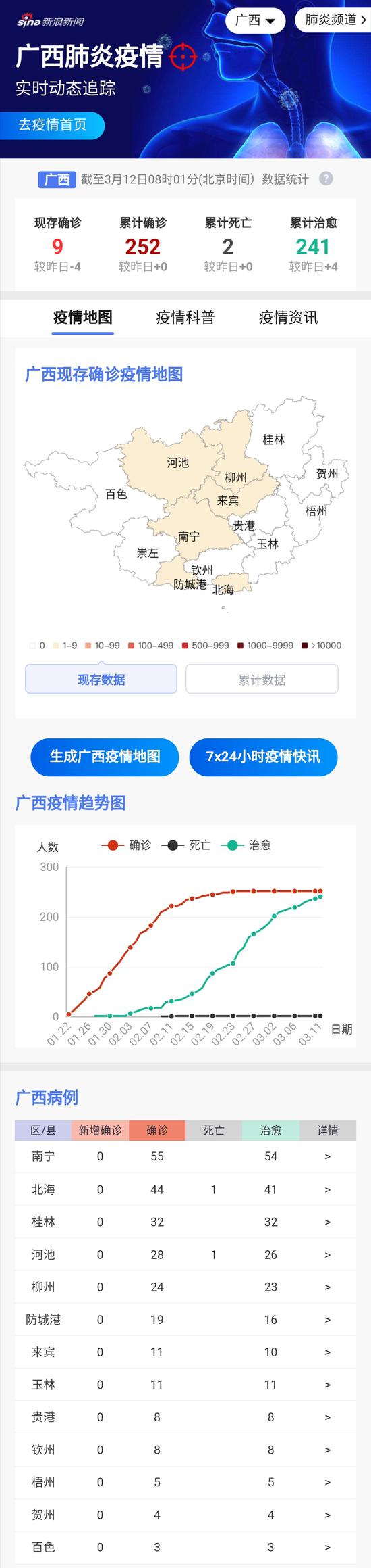 ![]() 来源:自治区卫健委 ![]() 3月11日0-24时,我区无新增新型冠状病毒肺炎确诊病例;无新增疑似病例;新增治愈出院病例4例(柳州市1例、北海市1例、河池市2例);无新增死亡病例。 目前全区累计报告确诊病例252例,累计出院病例241例,累计死亡病例2例(河池市1例、北海市1例),现有确诊病例9例,均在院治疗,其中危重病例4例(南宁市1例、北海市1例、防城港市2例);全区现无疑似病例。 累计确诊病例中,南宁市55例、柳州市24例、桂林市32例、梧州市5例、北海市44例、防城港市19例、钦州市8例、贵港市8例、玉林市11例、百色市3例、贺州市4例、河池市28例、来宾市11例。 本日新增境外输入病例密切接触者1人,新增外省病例协查密切接触者1人;全区现有8人(本地病例密切接触者1人,外省病例协查密切接触者1人,境外输入病例密切接触者6人)正在集中隔离医学观察中。 ![]() 现阶段,不管是人体体表消毒还是周围环境消毒,都应坚持“清洁为主、消毒为辅”的基本原则,如果过度消毒,不仅劳民伤财而且危害身体健康。专家建议,开展消毒工作应遵循消毒基本原则,没有必要进行以下六种情形的消毒:一是不宜对室外环境开展大规模消毒;二是不宜对室外雨雪天气的环境进行消毒;三是不宜对室外环境进行空气消毒;四是不宜对人员全身使用消毒剂进行喷洒消毒;五是不宜对外环境的水塘、水库、人工湖等投加消毒剂进行消毒;六是不宜在有人的情况下对室内空气进行消毒。 |