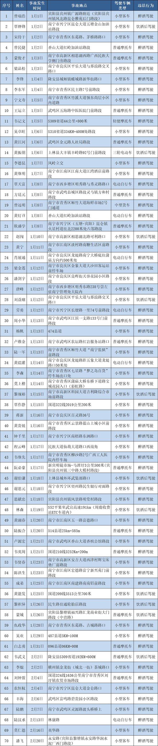 ![]() 酒驾醉驾是严重的交通违法犯罪行为,对此公安交管部门一直是“零容忍、严执法”。但是,酒驾醉驾违法仍然屡禁不止,特别是随着复工复产稳妥有序推进,道路交通运输秩序全面恢复,周末、夜间、农村公路涉酒交通事故时有发生。据统计,今年1月1日至2月20日,南宁市因酒驾醉驾导致的道路交通事故共70起,造成10人死亡,32人受伤。为进一步强化警示和震慑作用,南宁交警部门将对每一起酒驾引发的交通事故进行曝光,希望广大驾驶人吸取教训,引以为戒,坚决杜绝酒驾醉驾违法行为。 2020年1月1日至2月20日南宁市酒驾交通肇事一览表 ![]() 为了您和他人的幸福请牢记并自觉做到开车不喝酒,喝酒不开车! 来源:南宁交警未发布