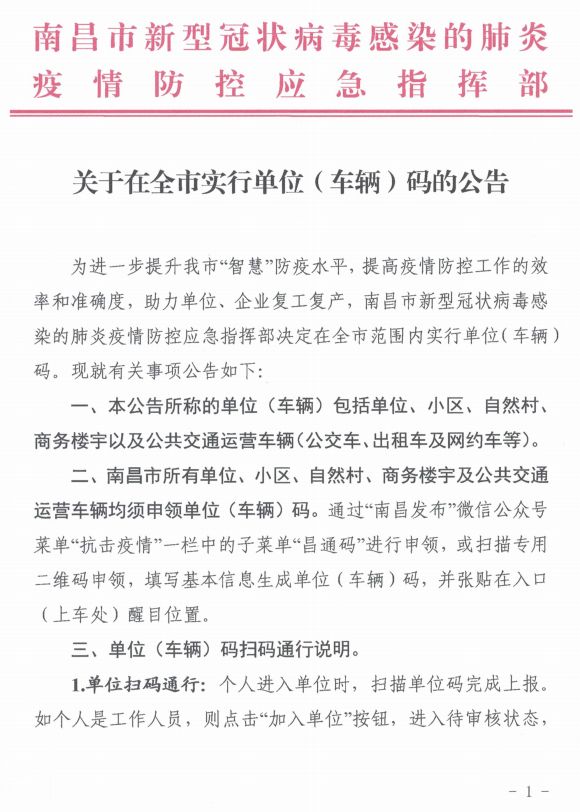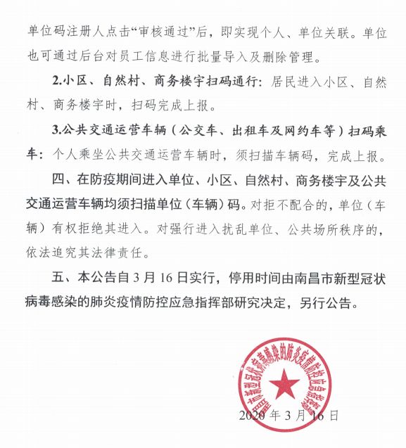 ![]() 专题:新型冠状病毒感染肺炎江西疫情动态 南昌市新型冠状病毒感染的肺炎 疫情防控应急指挥部 关于在全市实行单位(车辆)码的公告 为进一步提升我市“智慧”防疫水平,提高疫情防控工作的效率和准确度,助力单位、企业复工复产,南昌市新型冠状病毒感染的肺炎疫情防控应急指挥部决定在全市范围内实行单位(车辆)码。现就有关事项公告如下: 一、本公告所称的单位(车辆)包括单位、小区、自然村、商务楼宇以及公共交通运营车辆(公交车、出租车及网约车等)。 二、南昌市所有单位、小区、自然村、商务楼宇及公共交通运营车辆均须申领单位(车辆)码。通过“南昌发布”菜单“抗击疫情”一栏中的子菜单“昌通码”进行申领,或扫描专用二维码申领,填写基本信息生成单位(车辆)码,并张贴在入口(上车处)醒目位置。 三、单位(车辆)码扫码通行说明。 1.单位扫码通行:个人进入单位时,扫描单位码完成上报。如个人是工作人员,则点击“加入单位”按钮,进入待审核状态,单位码注册人点击“审核通过”后,即实现个人、单位关联。单位也可通过后台对员工信息进行批量导入及删除管理。 2.小区、自然村、商务楼宇扫码通行:居民进入小区、自然村、商务楼宇时,扫码完成上报。 3.公共交通运营车辆(公交车、出租车及网约车等)扫码乘车:个人乘坐公共交通运营车辆时,须扫描车辆码,完成上报。 四、在防疫期间进入单位、小区、自然村、商务楼宇及公共交通运营车辆均须扫描单位(车辆)码。对拒不配合的,单位(车辆)有权拒绝其进入。对强行进入扰乱单位、公共场所秩序的,依法追究其法律责任。 五、本公告自3月16日实行,停用时间由南昌市新型冠状病毒感染的肺炎疫情防控应急指挥部研究决定,另行公告。 2020年3月16日 ![]() ![]() 来源:南昌市新型冠状病毒感染的肺炎疫情防控应急指挥部 |