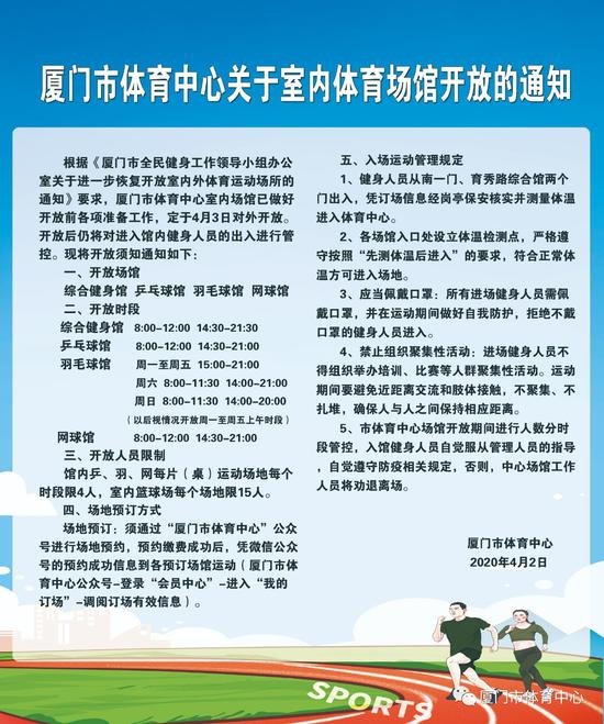 厦门市体育中心今天发布通知室内场馆已做好开放前各项准备工作,定于4月3日对外开放,开放后仍将对进入馆内健身人员的出入进行管控,开放须知如下: